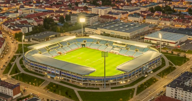 ピッチとの距離が近く、選手の迫力あるプレーを間近で感じられる一体感のある会場です。